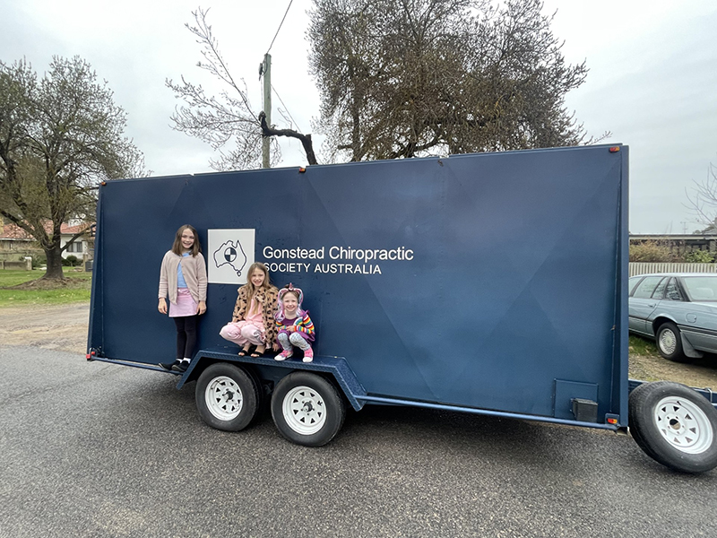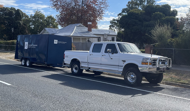 Toby takes care of the storage and transportation of the chiropractic equipment used to train students and doctors at seminars. Here is his big Ford F250 with the massvie Gonstead trailer attached, ready to head to Sydney.